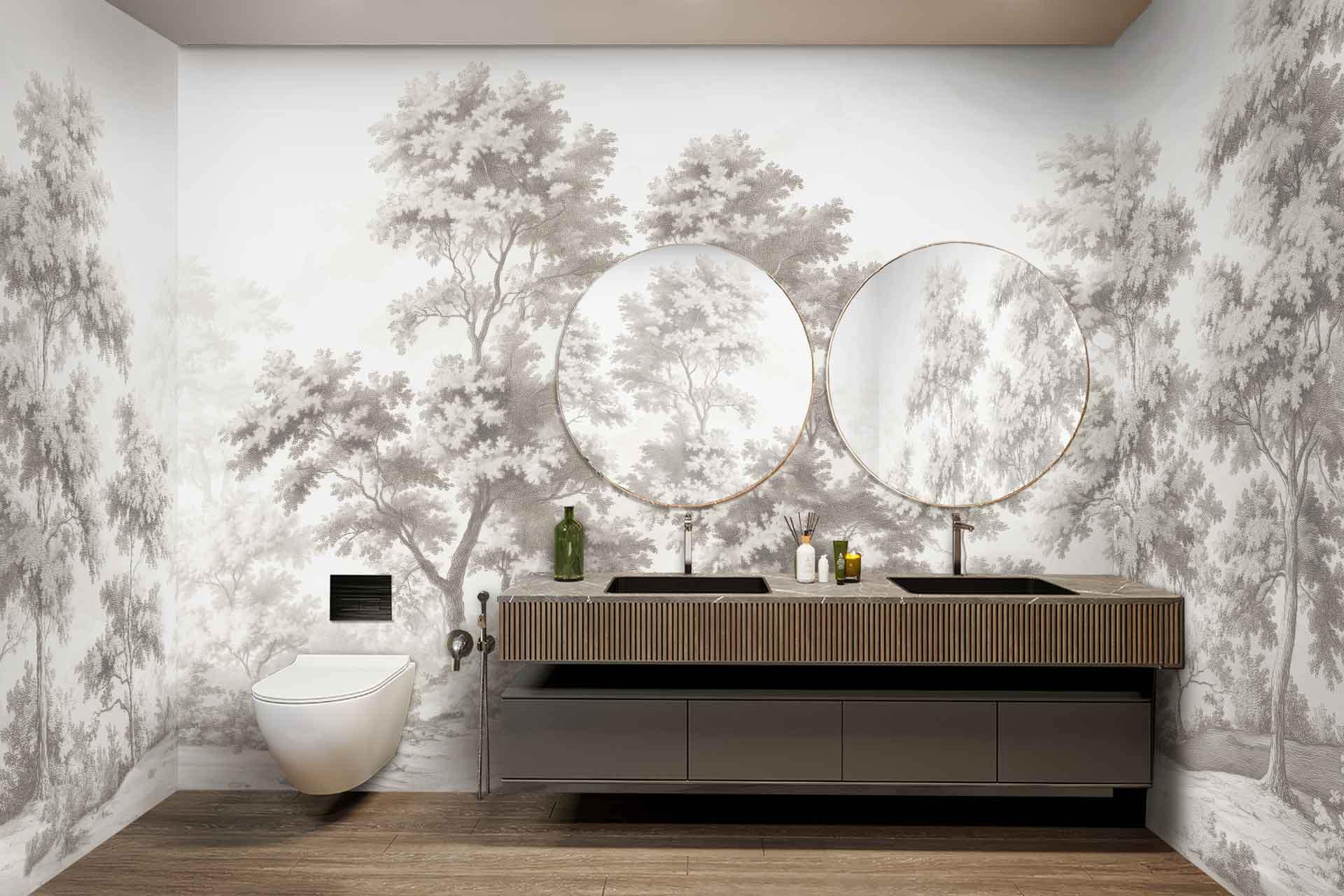 The bathroom features decorative wallpaper with bold, colorful floral patterns in shades of pink, green, and white. The distinctive wallpaper adds a vibrant backdrop behind the vanity and mirrors, easily highlighting its eye-catching design for search.