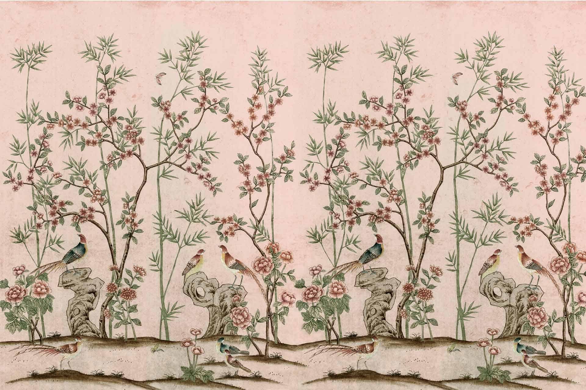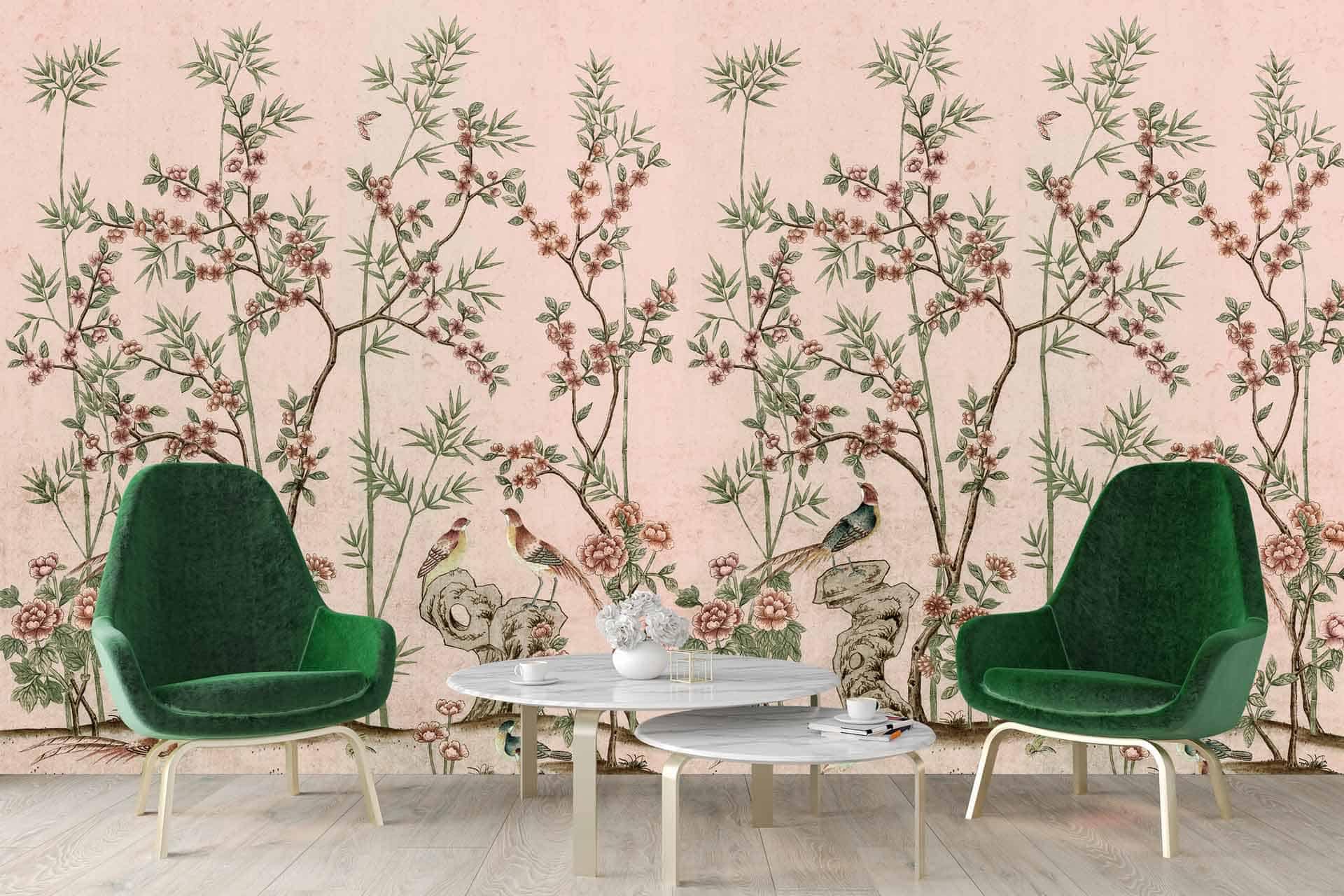 Vibrant floral and bird wallpaper featuring colorful flowers and birds in lively patterns, with bold hues of pink, green, blue, and yellow creating a dynamic focal point in the room.