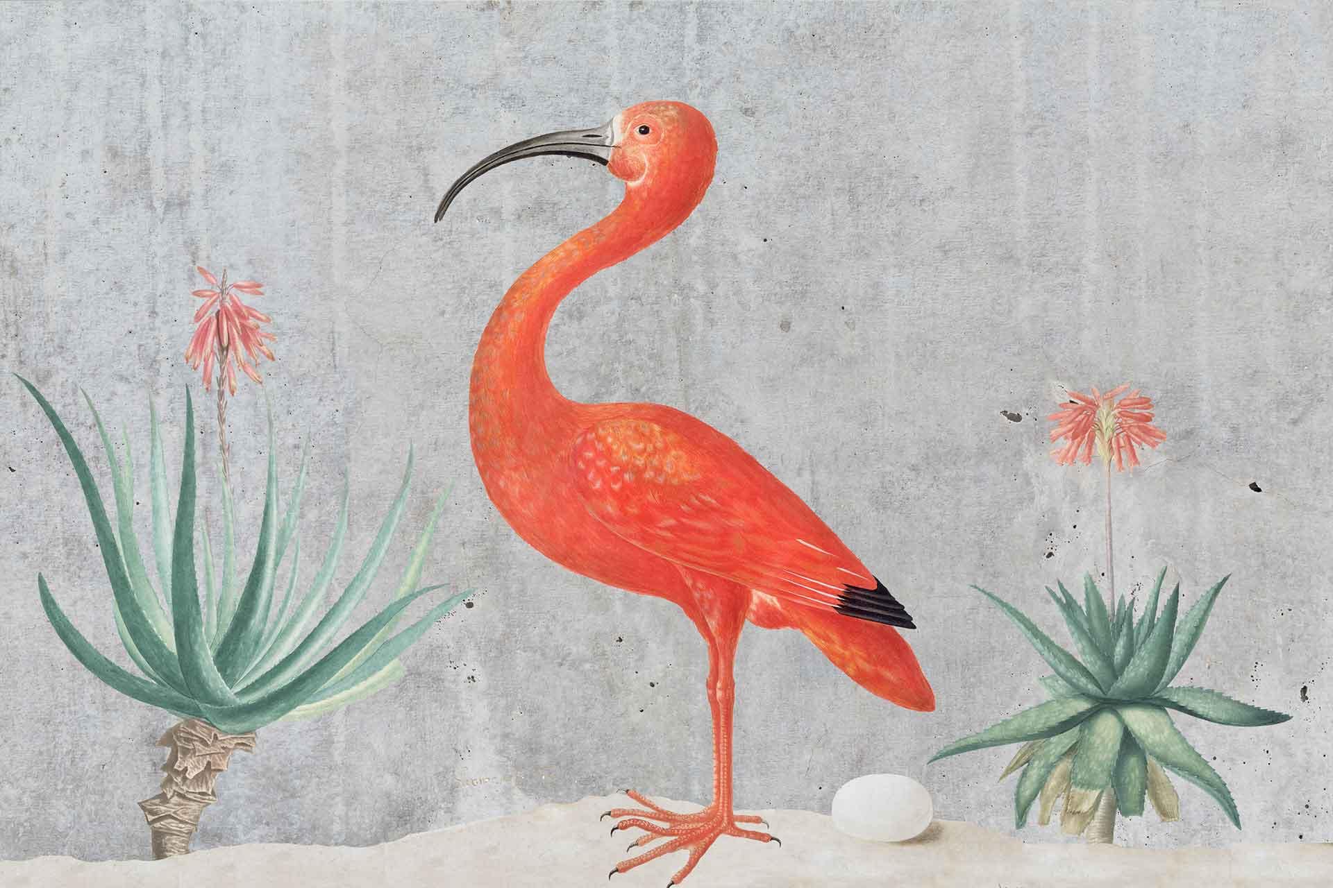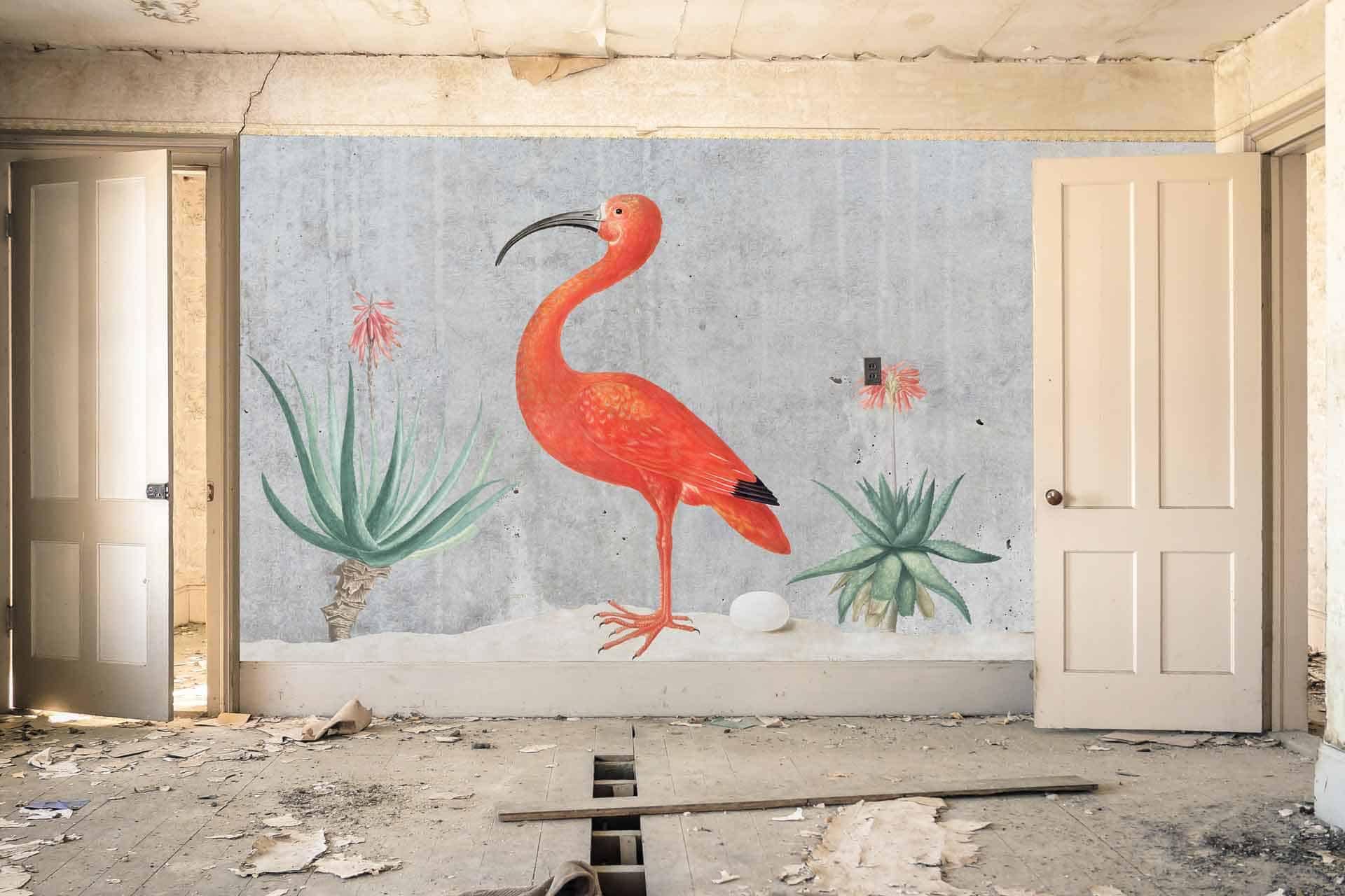 Vibrant floral and bird wallpaper featuring colorful flowers and birds in lively patterns, with bold hues of pink, green, blue, and yellow creating a dynamic focal point in the room.