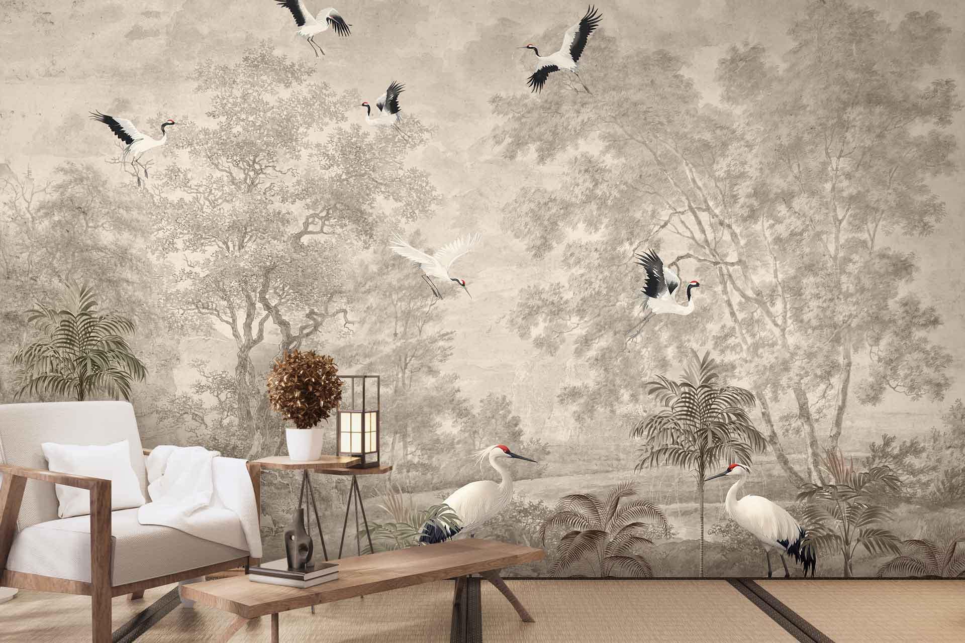 Vibrant floral and bird wallpaper featuring colorful flowers and birds in lively patterns, with bold hues of pink, green, blue, and yellow creating a dynamic focal point in the room.