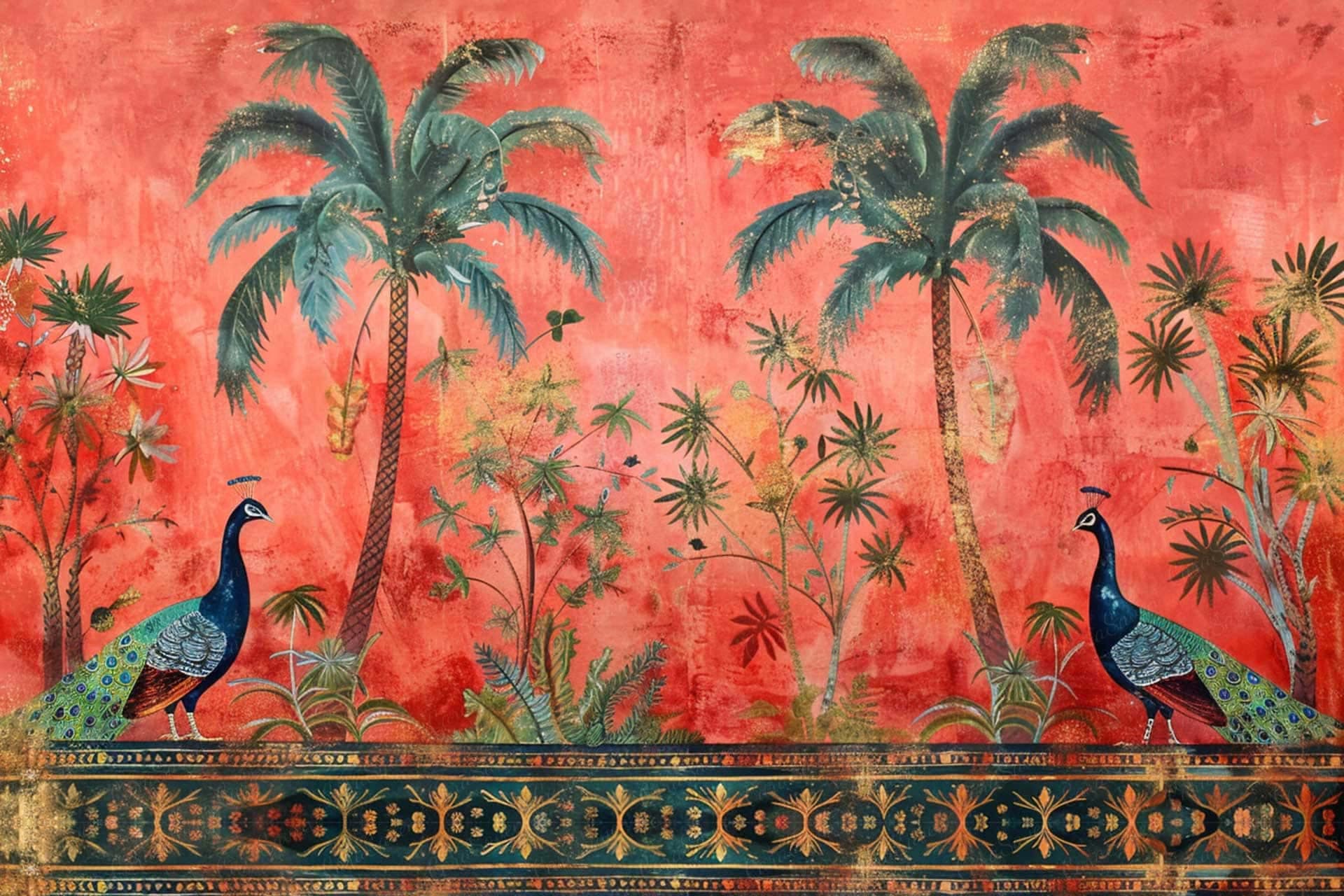 Vibrant floral and bird wallpaper featuring colorful flowers and birds in lively patterns, with bold hues of pink, green, blue, and yellow creating a dynamic focal point in the room.