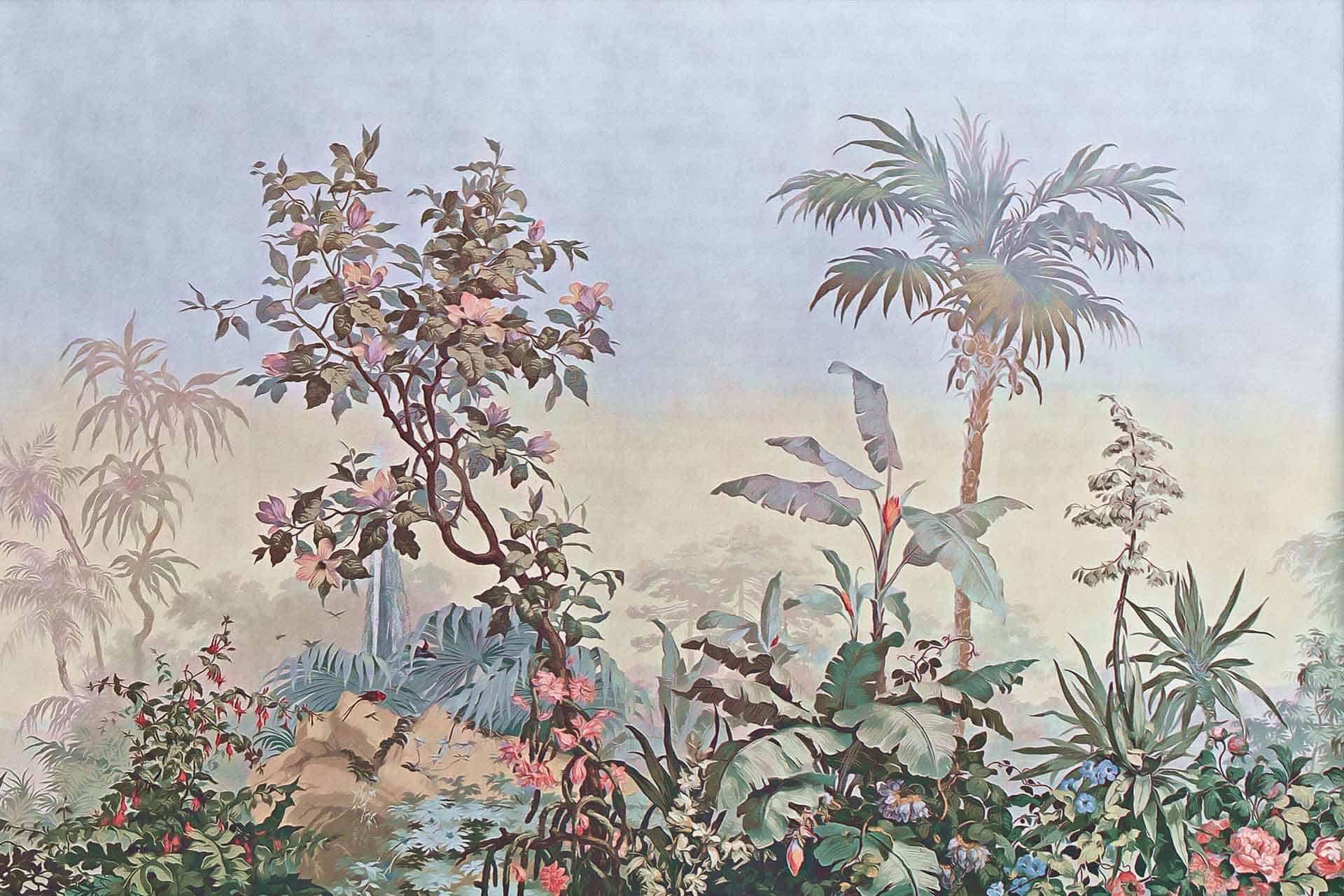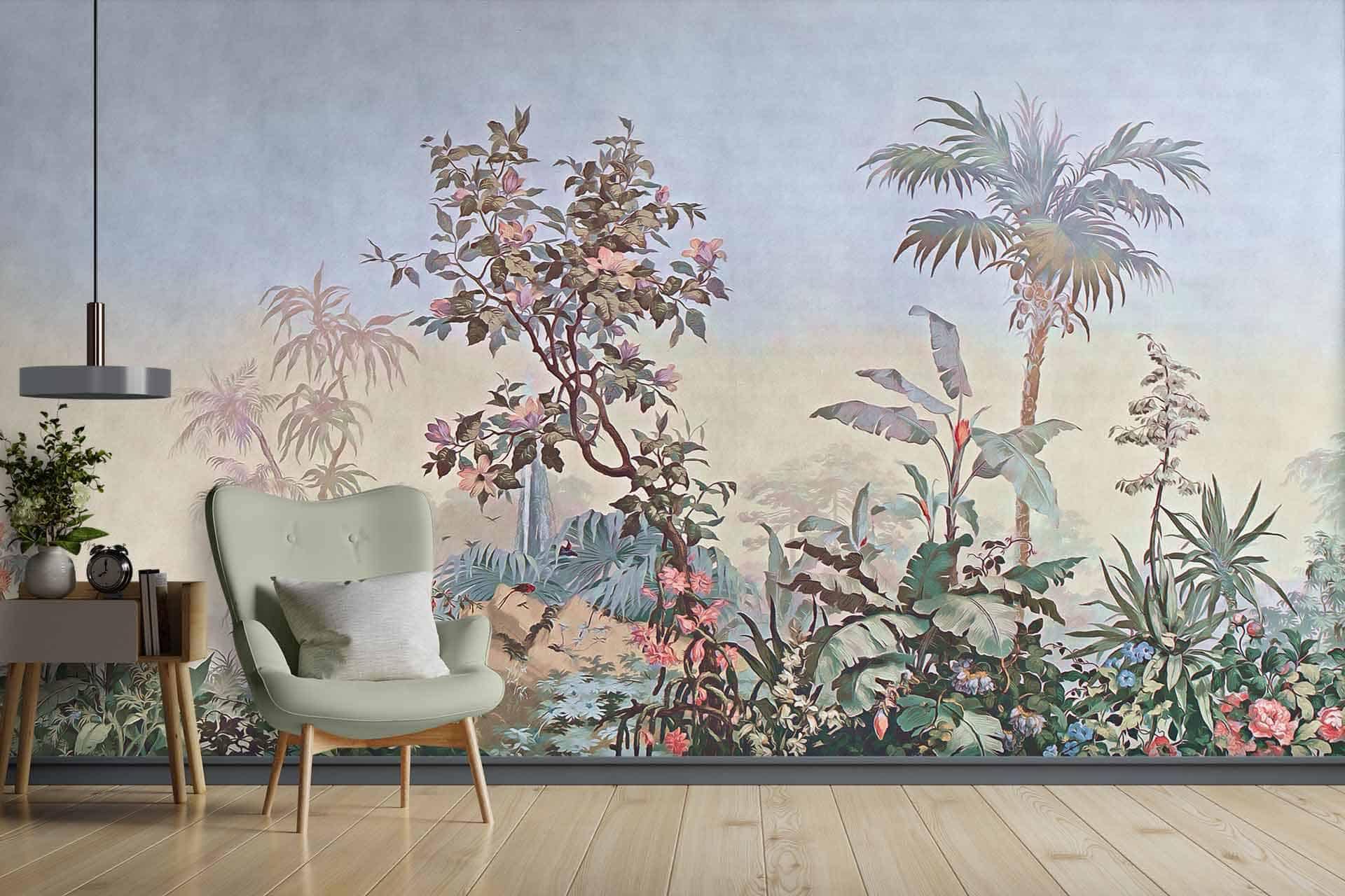 Vibrant floral and bird wallpaper featuring colorful flowers and birds in lively patterns, with bold hues of pink, green, blue, and yellow creating a dynamic focal point in the room.