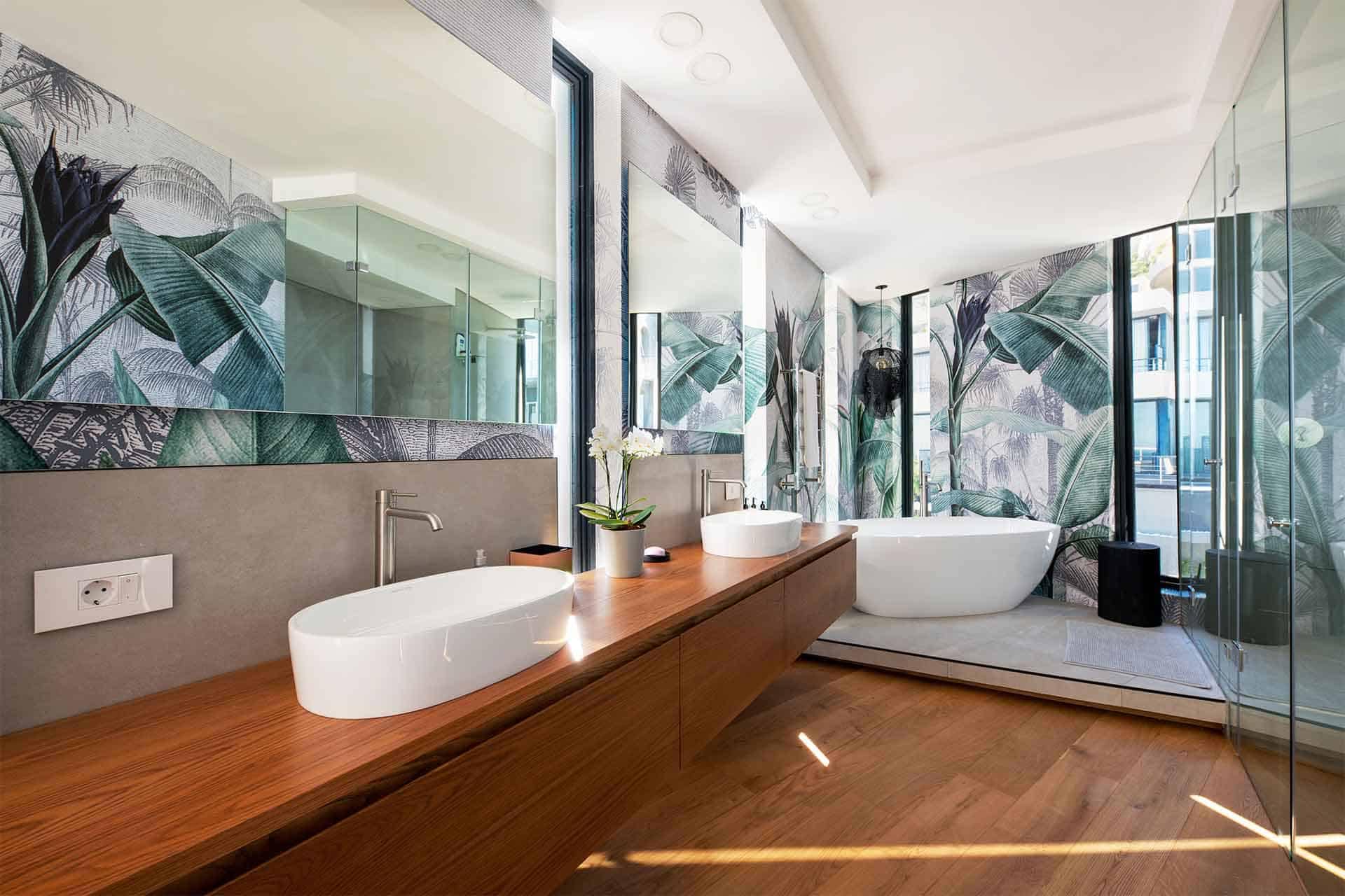 The bathroom features decorative wallpaper with bold, colorful floral patterns in shades of pink, green, and white. The distinctive wallpaper adds a vibrant backdrop behind the vanity and mirrors, easily highlighting its eye-catching design for search.