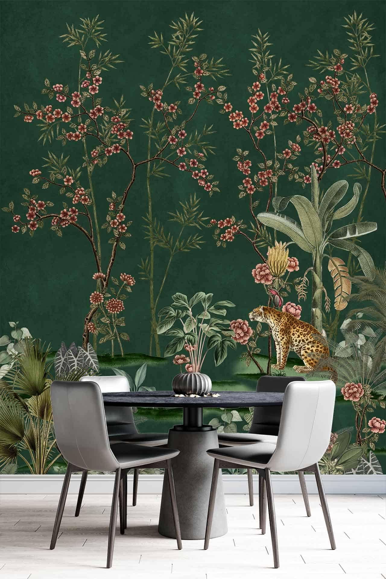 Vibrant floral and bird wallpaper featuring colorful flowers and birds in lively patterns, with bold hues of pink, green, blue, and yellow creating a dynamic focal point in the room.