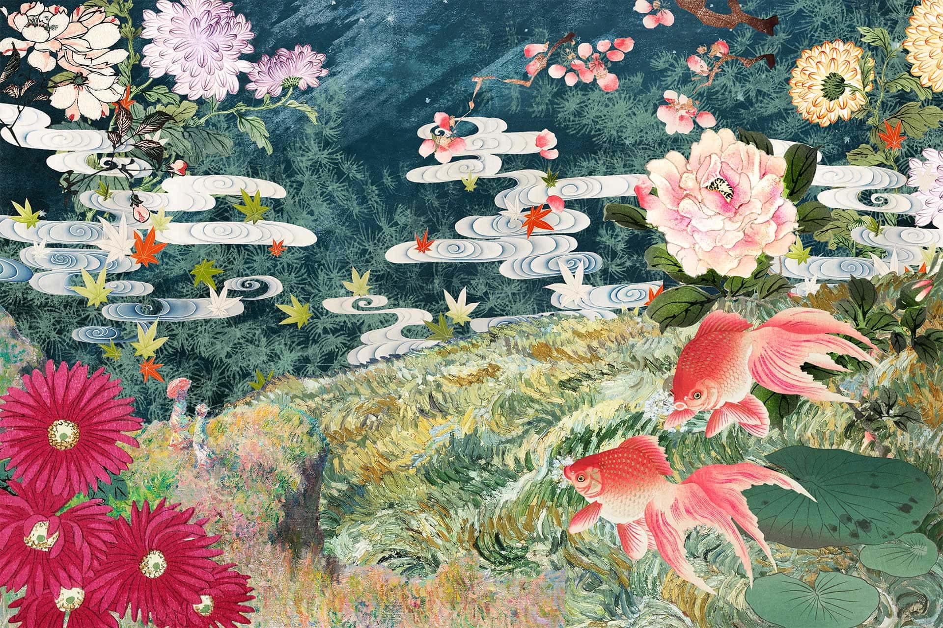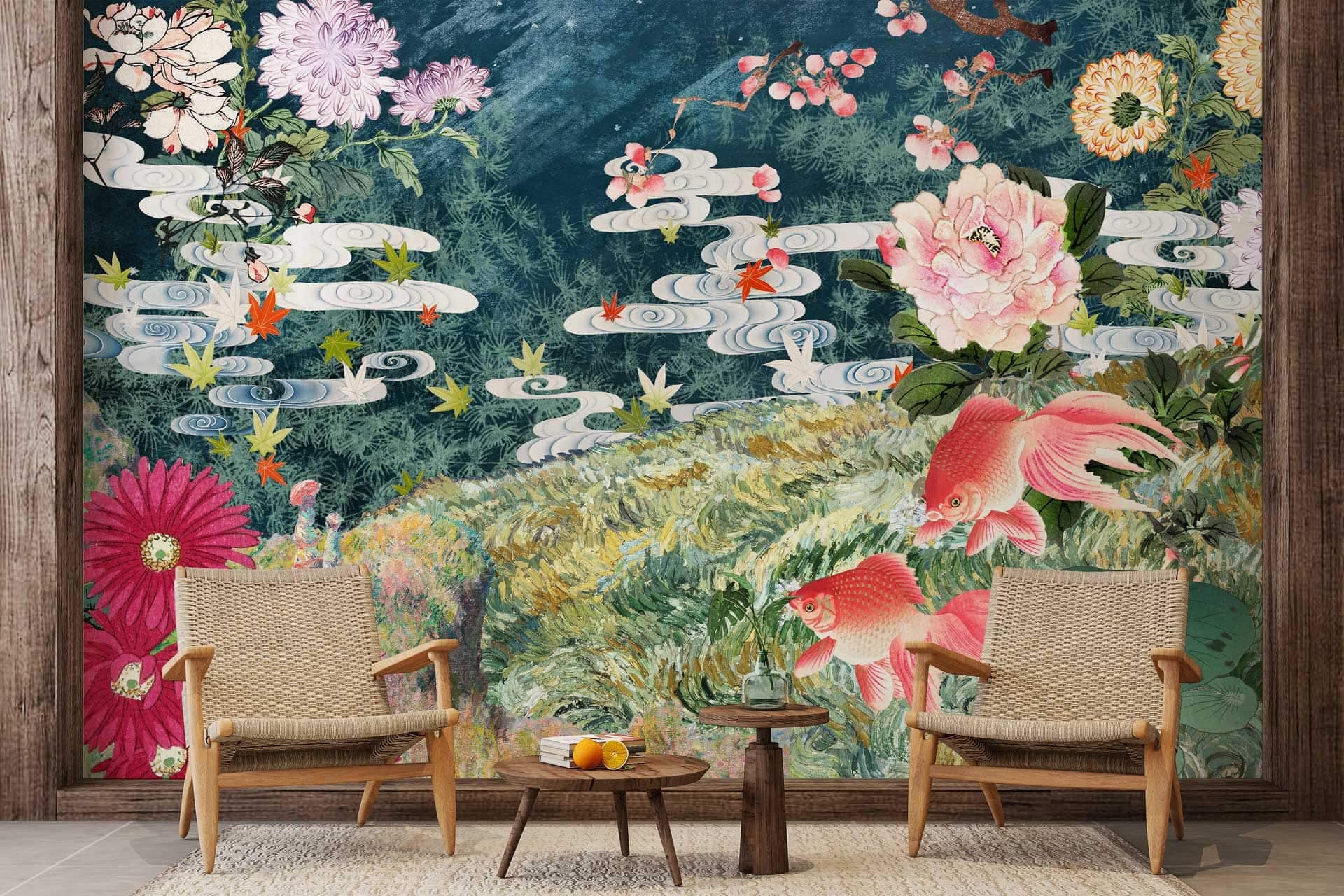 Vibrant floral and bird wallpaper featuring colorful flowers and birds in lively patterns, with bold hues of pink, green, blue, and yellow creating a dynamic focal point in the room.