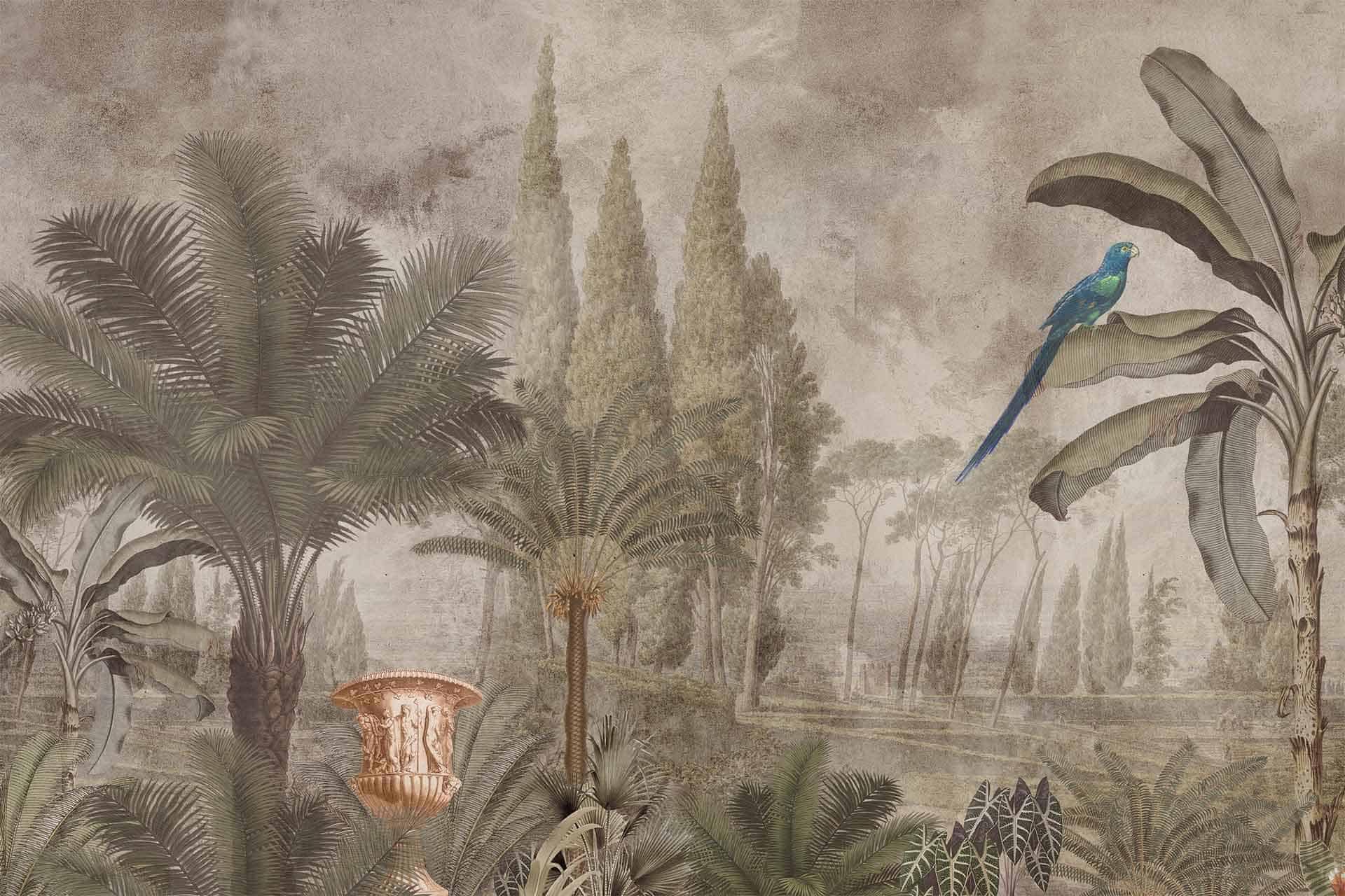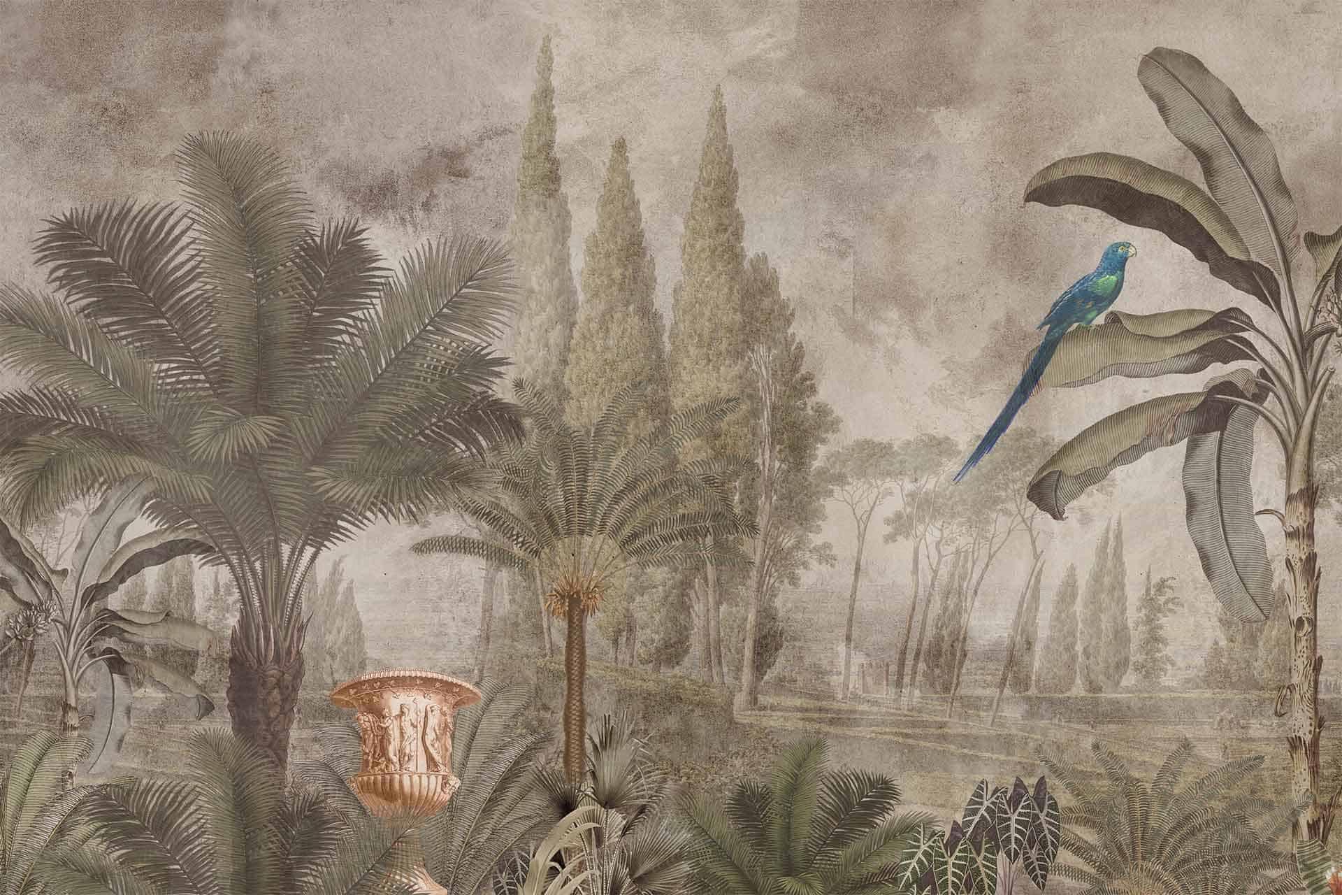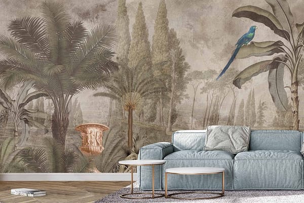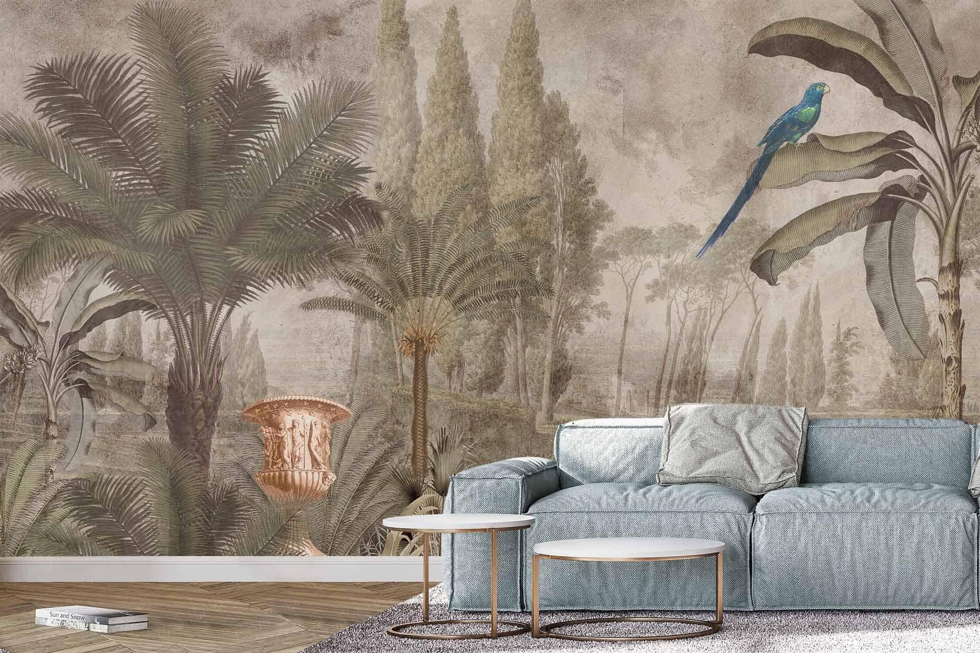 Vibrant floral and bird wallpaper featuring colorful flowers and birds in lively patterns, with bold hues of pink, green, blue, and yellow creating a dynamic focal point in the room.