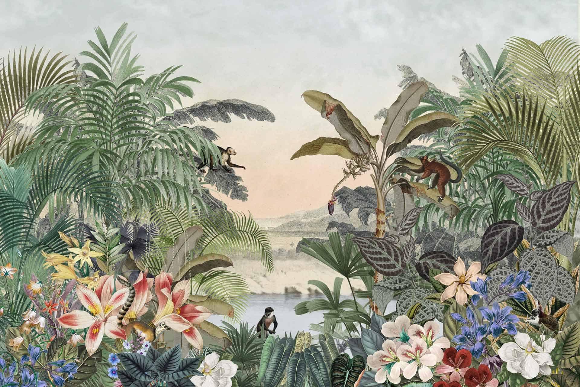 Vibrant floral and bird wallpaper featuring colorful flowers and birds in lively patterns, with bold hues of pink, green, blue, and yellow creating a dynamic focal point in the room.